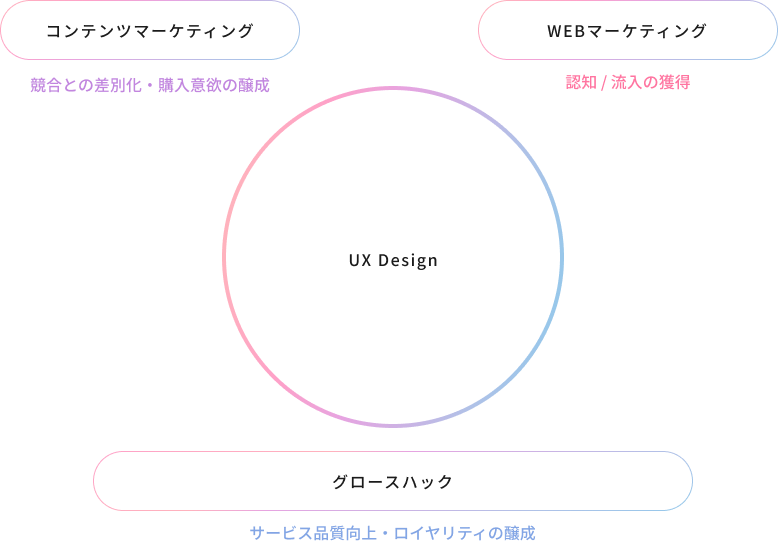 UX改善とグロースハックを通してクライアントの事業成長をサポートし、ユーザーが求める体験を届けることで、長期的な関係性と信頼を構築することを目指します。